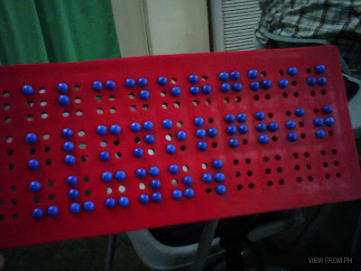 Mrs. Rosalie R. Condes told us first how the blind are taught. Just like regular students, the blind are given "pre-writing" exercises. If 'seeing' children are taught how to scribble and have a good grip on their pencils, blind children are introduced with different textures to prepare them in feeling the braille reading materials. They are also allowed to explore the braille stencils before they are formally taught the letters of the alphabet.